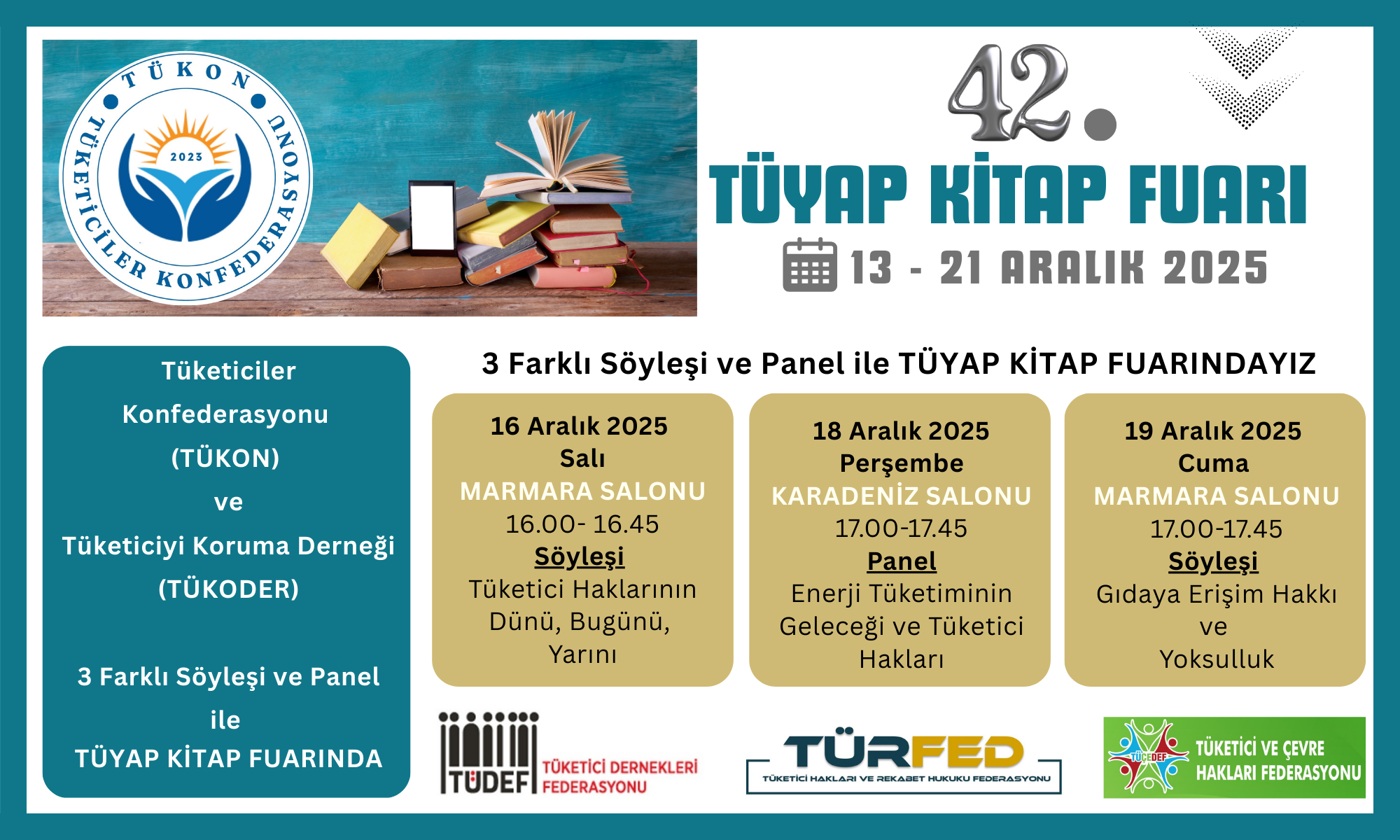 TÜKON Tüketiciler Konfederasyonu ve Tüketiciyi Koruma Derneği de Kitap Fuarı’nda “Stant” açacak ve 3 farklı söyleşi ve panel gerçekleştirecek.